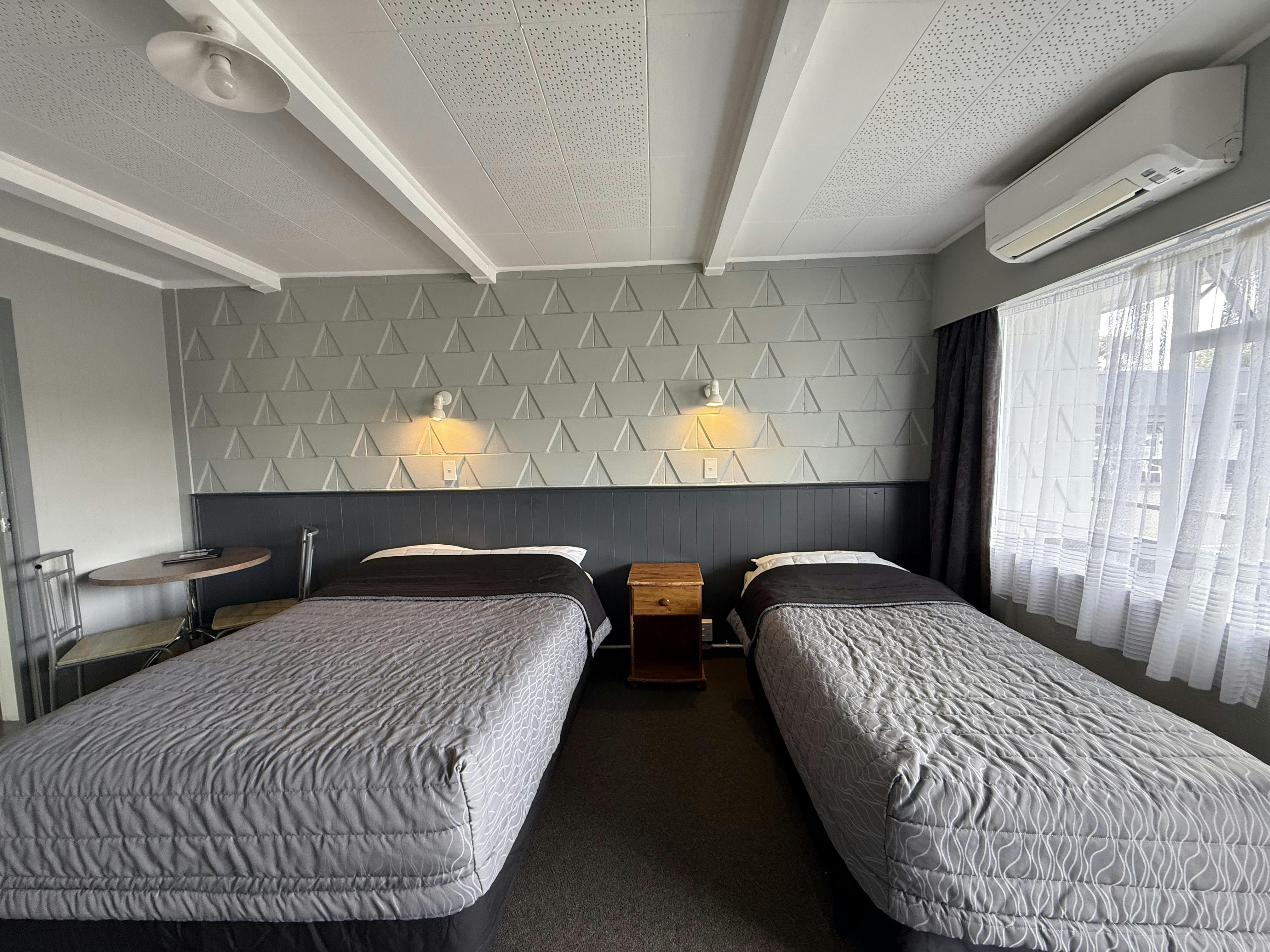 Spacious Studio unit complete with 1 Queen Bed and 1 Single Bed. Ironing, Facilities, TV with 50 Sky TV Channels, Tea/coffee and ensuite bathroom. Kitchen & Dining facilities, 2 plates, induction cooker, Refrigerator, Microwave, Electric Kettle. Free Unlimited Wireless internet available. Heat pumps / Air Conditioning. Guest Laundry onsite. All rooms are on the ground floor with parking directly outside.